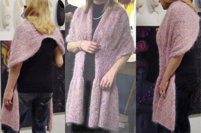 Three years ago I decided to design a wrap that one could fling on and off and that would stay in place without the use of a shawl pin. While shopping in Saint Louis, I noticed this scarf that undulated in and out. I though I could do that same concept with a shawl. The idea for “The Fling” was hatched.