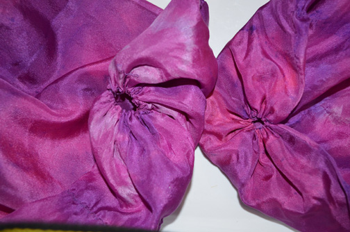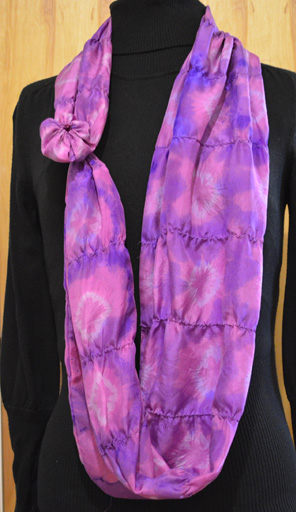 There has been a hard and time consuming lesson this week. It is that the silk that I purchased shrinks. I decided to line a scarf that I had knitted for one of my daughters. After dying and doing Shibori resist on lining #1 it came up a good 4” to short. I chalked this up to me just not paying attention and cutting it too short.