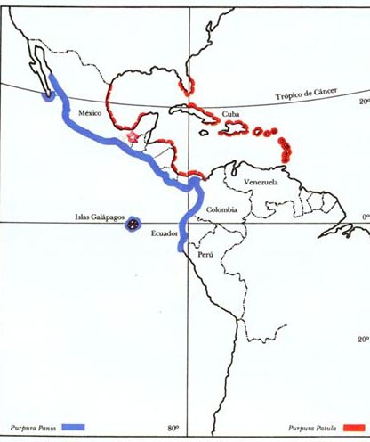 On the Oaxaca coast of Mexico, a small band of sixteen men carry on an ancient tradition. They coax a thimbleful of ink (really a narcotic to paralyze prey) from the mollusk Purpura Pansa. For centuries, this beautiful purple yarn has been woven into posahuancos, a traditional sarong like skirt.