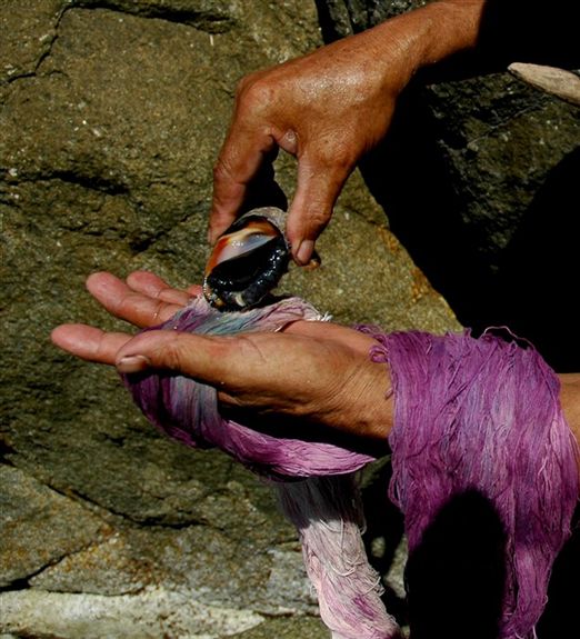 The dye season lasts October through March. Only large mollusks are milked. After milking, the shell is returned to a protected crevice unharmed so the mollusk will regenerate its ink.