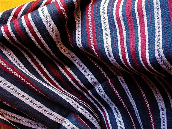| Traditional cloth woven with the Purpura Pansa dyed cotton. The skirts have bands of purpura, indigo and red (dyed with cochineal) on hand-spun silk. These lengths are woven on back-strap looms. |