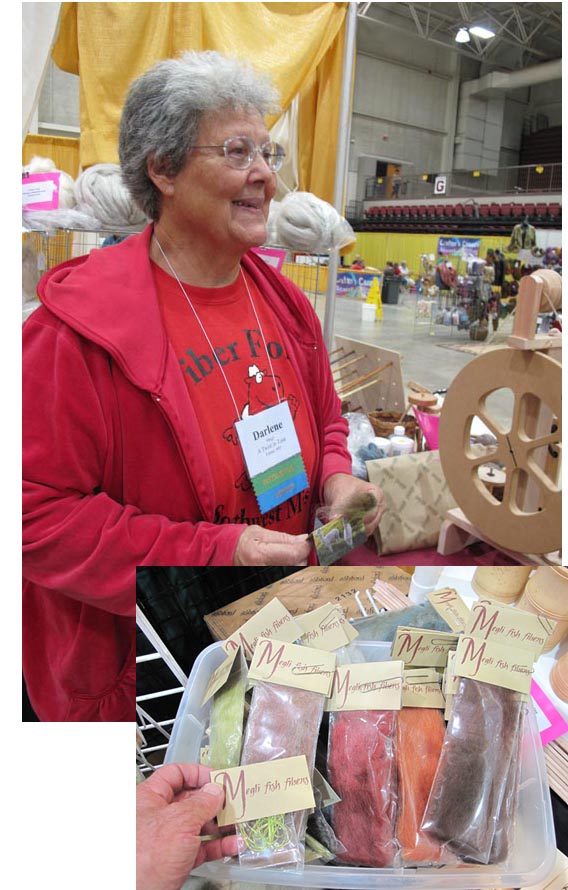 | Darlene Megli, who with Judy Crouch has A Twist In Time Fiber Shop. We were asking Darlene about her newest entrepreneurial venture, Megli Fish Fibers-alpaca fibers for fly fishing lures. |