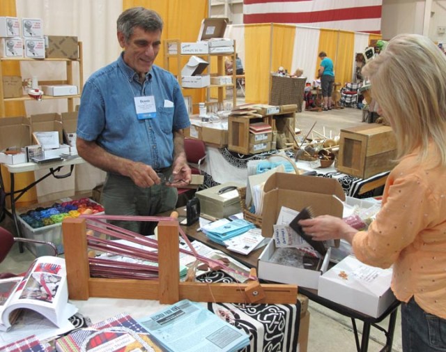 | Leslie Carol on the left teaching rigid heddle weaving and Janet Wray on the right, demonstrating an electric spinner. They are the creative duo behind Jwrayco. Check out their gorgeous colorways for sock yarn on ETSY |
