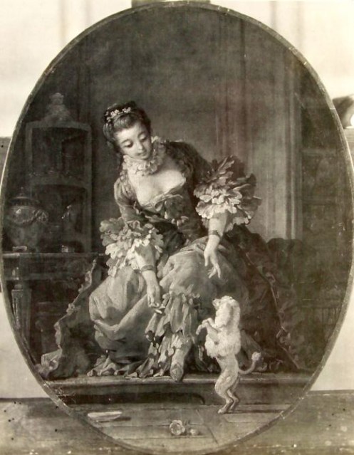 One hundred thousand pieces of original art are still missing from the art pillage during World War II. At this point, La Gimblette is still among the missing. One can only guess what beautiful colors Boucher used because all we have is this small black and white photo. Maybe someday the beautiful girl and her dancing Poodle will find their way back home.