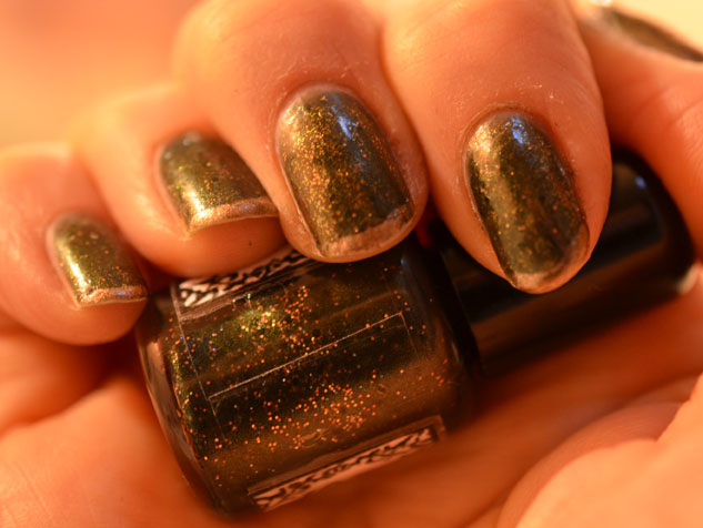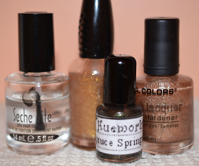 One of the “throw ins” was a green polish with orange micro glitter named Spruce Springsteen. The name alone made me want it.