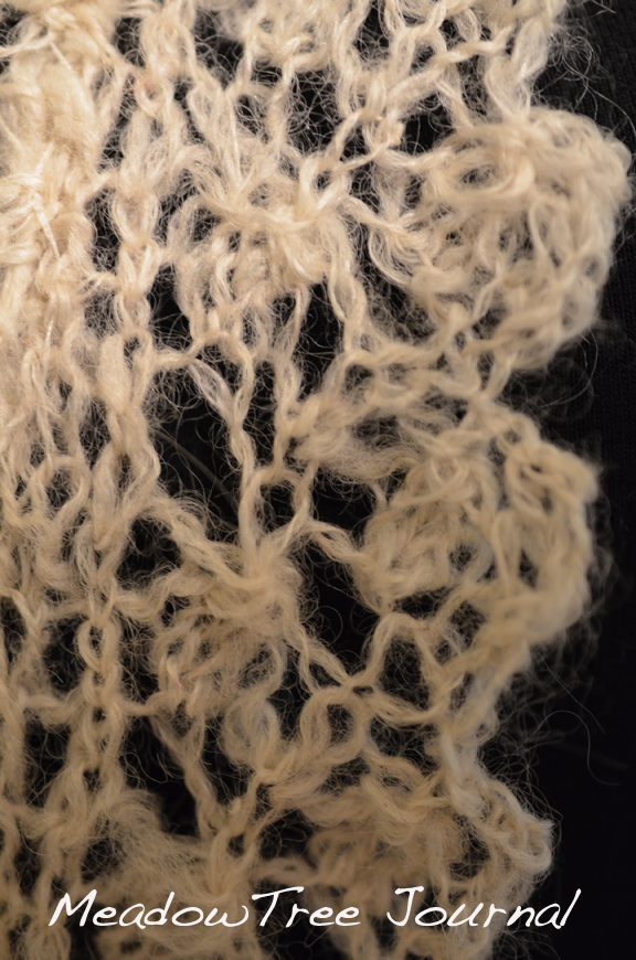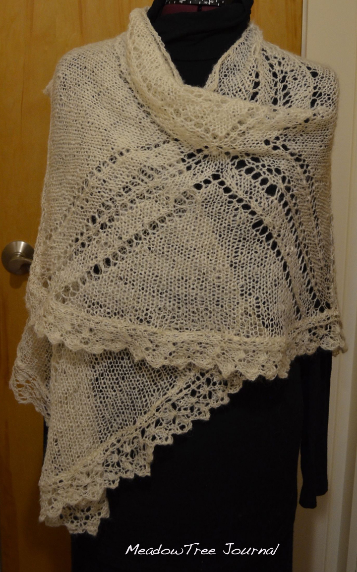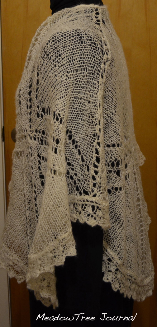 Unfortunately, I didn’t keep records on the yarn. I think it is Merino, Mohair, and silk. I’m glad I had enough because it would have been a problem to reproduce it. This is why is is always smart to keep records, even if you think you will never need any more of what you are making. This has to be one of the few times that I didn’t take down very specific notes on a yarn. And hopefully, it will be the last time. I think I learned my lesson. I was getting very worried at the end of this knitting project because it looked like I was not going to have enough yarn to finish with.