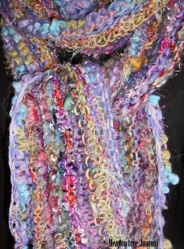 3.     YARN CHOICES-I use quite a lot of multi color and textural yarns in various thicknesses. Solids colors are also important. If I had to put it in numbers, I would say it is a 40 % multicolored yarn, 40 % textural yarn, and 20 % solid yarn mixture.  I you have a thread yarn; it is always good to have a solid to knit along with it.