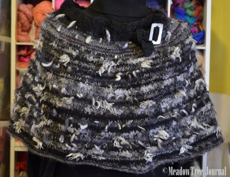 My caplet-the first project that I used the” Change Of Row” technique with. There will be a fair amount of beginnings and ends so I sewed in yarn ends every few rows so it would not be so overwhelming at the end of the project.