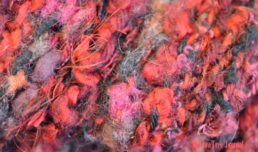 7.     AT THE END OF THE ROW, decide how long you want the fringe and cut the yarn a little longer. Don’t worry about getting all the yarns the same length at this point. They can be trimmed up when the project is finished. Start knitting with the second yarn. After a few stitches, I go back and tie the yarns together at the base of the knitting. Then, I don’t have to worry about any stitches coming loose and don’t have the drudge task of tying the entire fringe at the end of the project.  Knit two rows, tie two row is my mantra on that one.