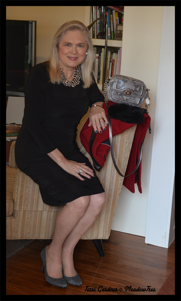 I donned one of my LBDs for the occasion and added a few accessories that suited my mood. For this Saturday night, I used gray and silver with a small flash of rhinestone.
