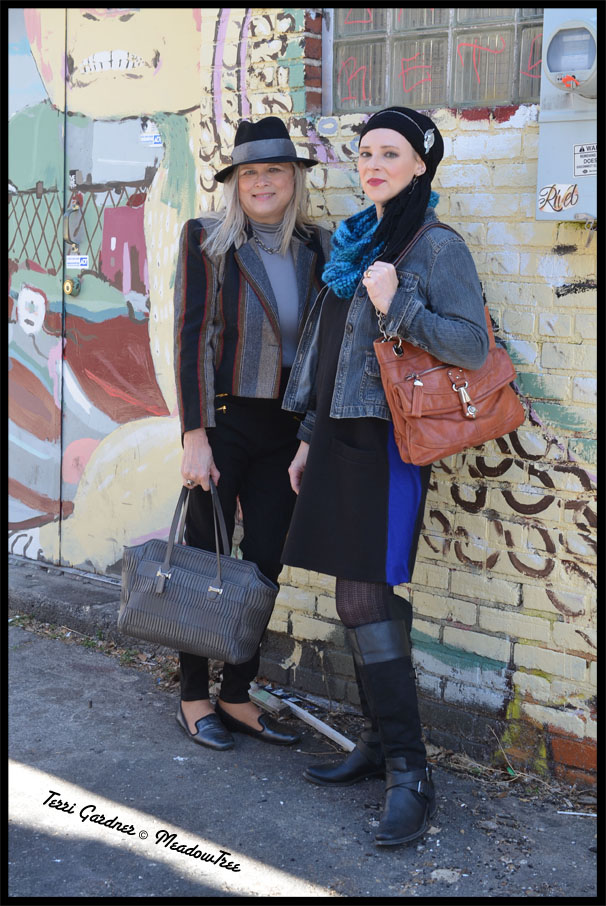 I talked Michelle into some shots with me. She describes her style as Boho. She is a knitter (her scarf) and readily Refashions thrifty finds. The black jumper she is wearing was too small so she found the perfect cobalt blue dress (the dress was pretty hideous), cut panels for her jumper from it and now has this mod chic dress.
