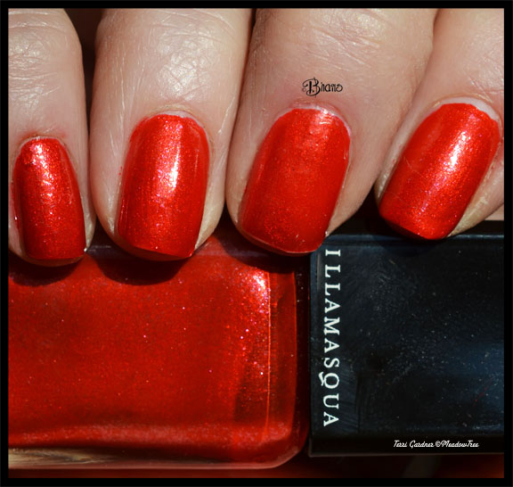 I am coming off a three year spree of polish buying and have quite of few of red to orange shades. I thought Boudicca by Illamasqua matched this outfit. This polish glows on it’s own. This is intense red orange with orange and pink micro-flakes. lllamasqua makes a very high quality product and I find it on Hautelook when Illamasqua is a featured sale and that is quite often.
