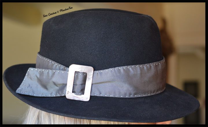 This is a Style Blog so let’s get to it. The star of the show, for me, is my hat which belonged to my Dad. When he passed in ’95, I got his hats. This particular black Fedora sat in a closet because it had an ugly grey vinyl band and the same thick vinyl interior band which made it too small for my head. FINALLY after twenty odd years, I decided to do something about it. I replaced the band with grey silk that I edge stitched with light grey silk thread. The finishing touch was a vintage mother of pearl buckle, all which was from my stash. The interior band was replaced with a band of grosgrain ribbon and it then fit perfectly! I also made a cheetah band for it, but that can be for another time.