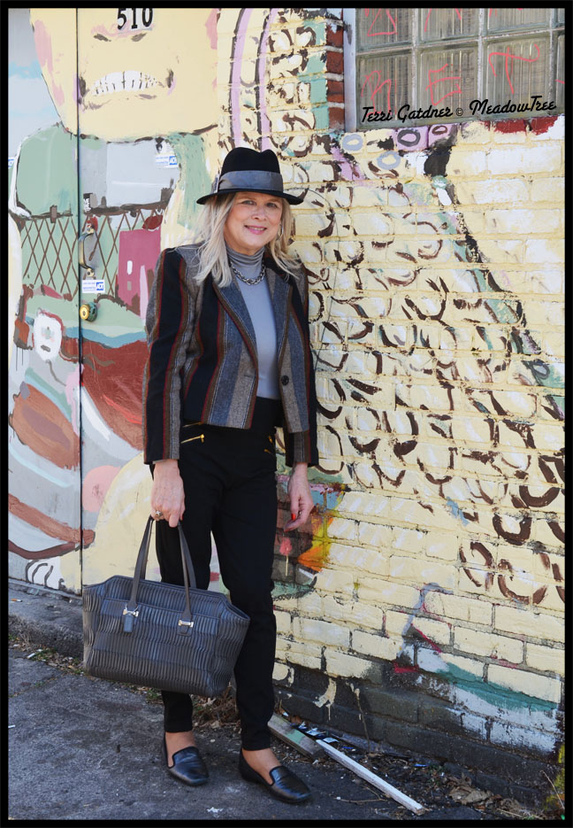 My bag is Coach (got to love that online sales outlet) and my shoes are pewter colored smoking flats by Nine West. As usual, I am a mix of name brand, thrifted and DYI fashion. That’s just the way I have always done it. I will probably never have one of those “shop this look” because of how I shop. So it goes.