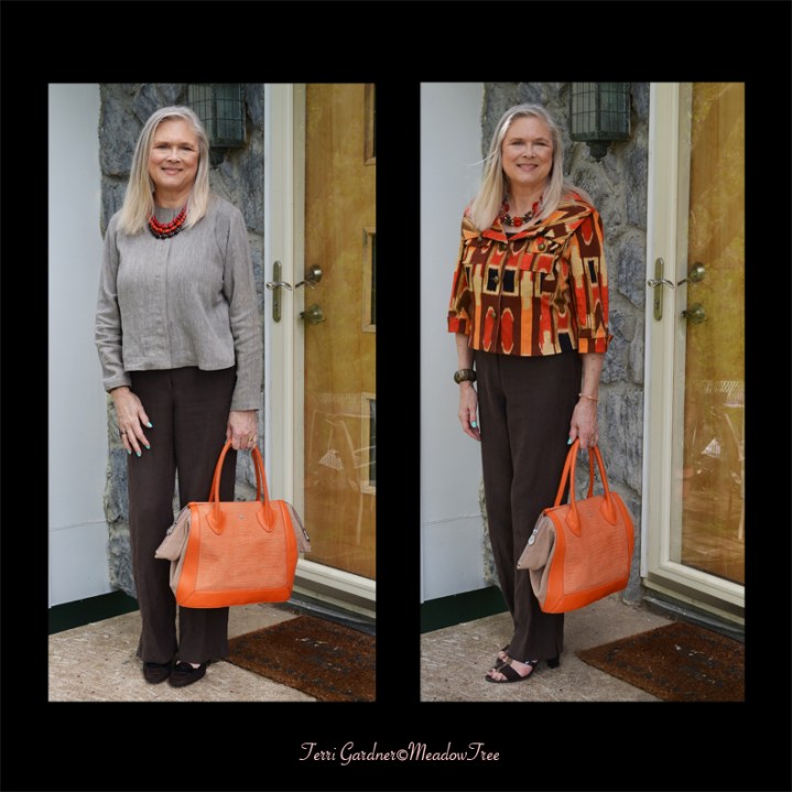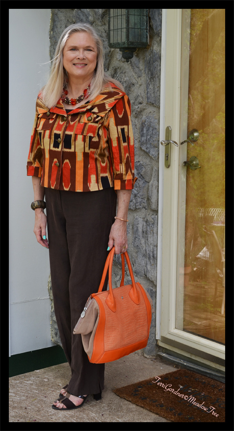 So here goes on the decisions I made. I built both looks with some Charter Club 55% silk/44% linen dark brown slacks (from eBay at a consignment shop price) as the base. The jacket, which I have wanted for a long time, is Asiatica by Fifi White, a Kansas City designer. I finally made it to Act II, a consignment shop in Kansas City, during a 30% sale on all their Asiatica consignments. This one fit, I liked it and the price was right (for an Asiatica). What bugs me is that we couldn’t find a fiber content label. Asiatica’s hallmark is re-purposing vintage kimonos into wearable garments. They do other types of designs along the way, of which this jacket is an example. I really think it is a heavier silk; however, I am just not sure.