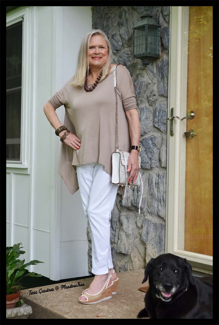 With it , I paired my yet to be used white camisole and white pants and let them dictate the black and white theme for the accessories. The black, white and silver flats are by Nine West (TJ Maxx), as is the bag. The bag came from Nine West’s online outlet store site. I wished I had read the measurements a bit better on this bag. It was described as a bucket bag. They should have added “…it’s big enough to put oats in to feed your horse oats..”! It really is huge. The black and silver jewelry are pieces I have picked up over the years and quite frankly, sometimes I forget where I get things. We are talking a few decades of collecting.