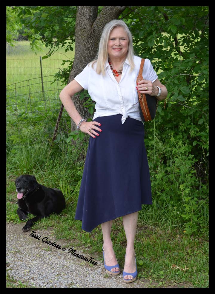 Rather than a denim skirt, I chose my Tomboy Design of Kansas City’s by Laura McGrew asymmetrical cotton knit skirt. It is super comfy and makes me happy.