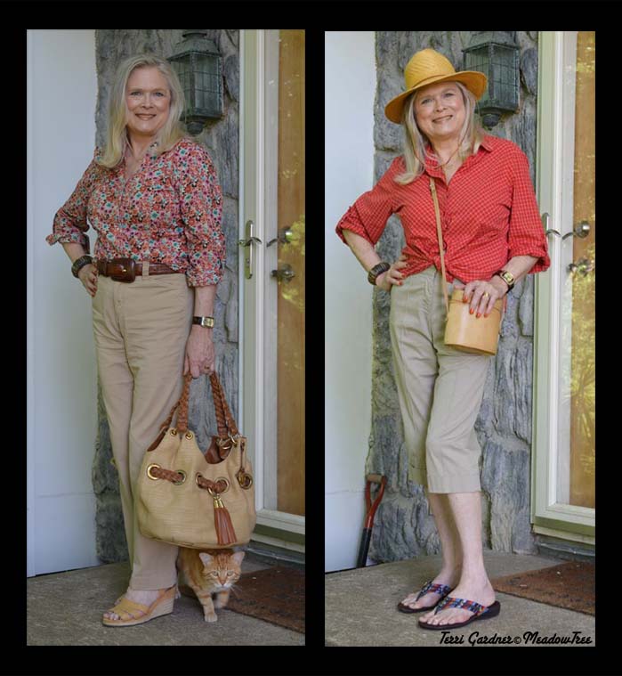 I ended up doing two looks for this day. The one on the left is the “official” one. I have my one and only flower printed blouse (Style and Co. at Macy’s) and purchased it because of its lines. It has gathered panels and is very slenderizing. The khaki pants are from The Gap. I altered the legs after I thrifted them as mentioned.