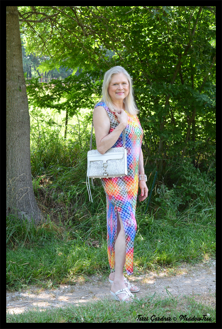 That retired art teacher would be me. When I saw this dress on the ASOS-US website about three years ago, my heart went pitter patter. I love digital prints and this prismatic abstract had every hue in the color wheel represented. How could I resist? It was also on clearance, which made it even sweeter.
