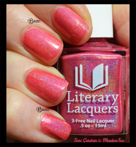 As all of Amy’s lacquers, this name was inspired by a book. Tonight’s Adventure was taken from Wild Nerd Yonder by Julie Halpern. It’s a coral orange/pink with copper and orange shimmer along with a really pretty linear holo. You can’t find beauties like this one in the drug stores. The quality of Literary Lacquers is Five Stars. I can’t say enough about what this lady comes up with.