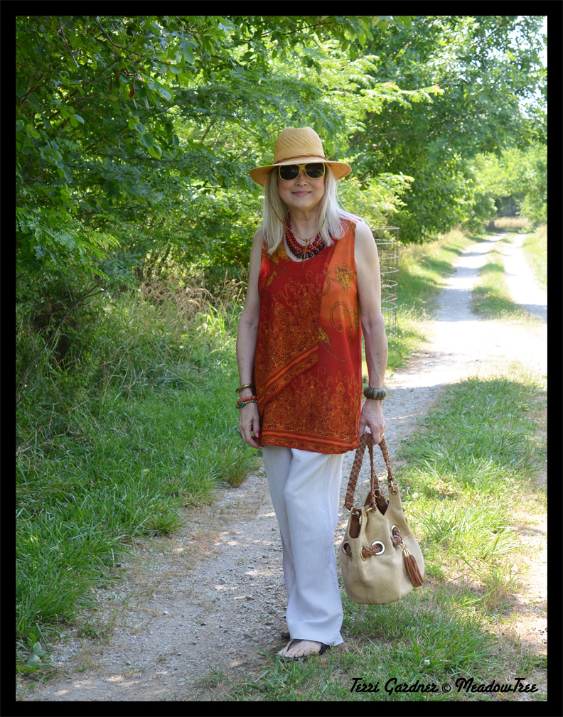 My loose linen trousers have a tie waist which makes them easy wearing. They are by Carol Little and have been in my closet since the early 2000s. The Indian print top is rayon but it has always been cool, probably because of it being sleeveless. I picked this up at a thrift shop in Florida and used to think that only Florida had the good thrift shops. When I would visit my sister, I would take an extra collapsible suitcase with me! But now that I have found some wonderful stores in Missouri, my sister Donna and I will have more free time. She won’t have to take me to every thrift in the three county area (but you know thrifting, we will have to visit some)!