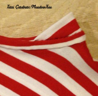 I added cuffs because I wanted to see what they would look like and can always change them later if I tire of them. The neck was a little wide. Although I thought I fixed the problem when I cut the fabric out, I had to do some on-the-spot redesigning with the addition of some cross-pieces of fabric. Also, I added a binding to the neckline rather than just turning it under and stitching. I just like a bound edge better.