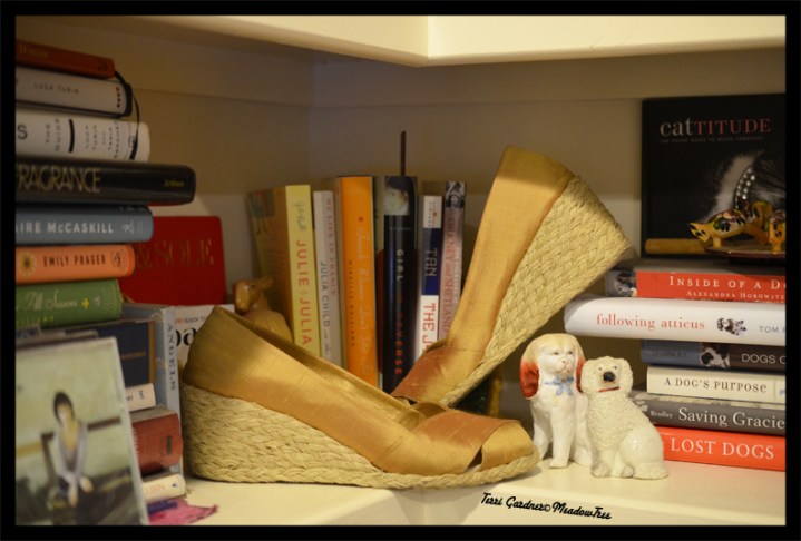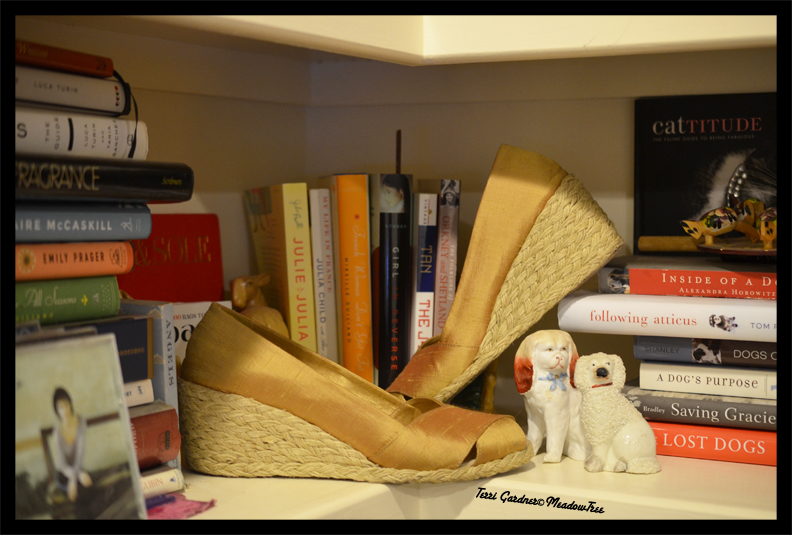 I am closing with a shoe still life. This is inspired by Cheri of The Style Nudge. She always presents her shoes in such creative ways. I am showing my silk espadrilles with a few of my books.