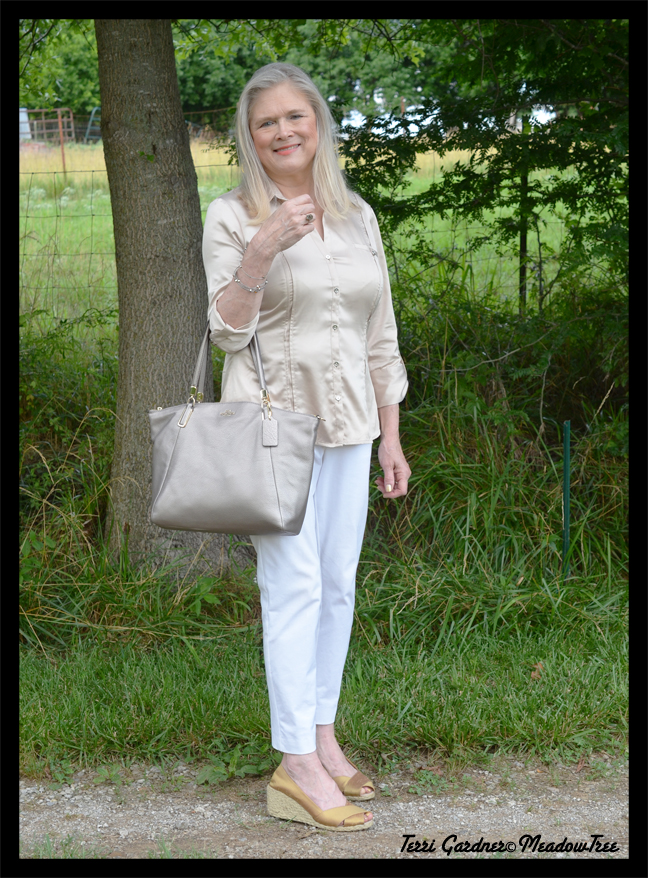 Now for the problem child which is my Ralph Lauren espadrilles. They are a silk gold shantung and I fell in love with them and thought they would be easy to style. So far, in the past three years, I may have worn them three times and I really don’t think they are quite in sync color wise for this look. However, I am determined to wear these shoes! I will keep trying different things with them. Maybe they will pop up here again.