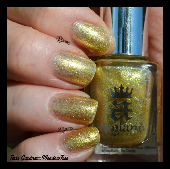 I don’t think I have ever had a-england on the blog before. It’s a British polish line created by Adina Bodana. A-england is A+ when it come to formula and is highly regarded in the polish world. With collections titled The Mythicals, Gothic Beauties and Heavenly Quotes a-england the most romantic polish line I know. The golden color I am wearing for this post is and the moonbeams from the Heavenly Quotes collection. Unless you live in Britain, the only way to get a-england is from an online company that specializes in a world selection of polishes such as Color4Nails and Beautometry.