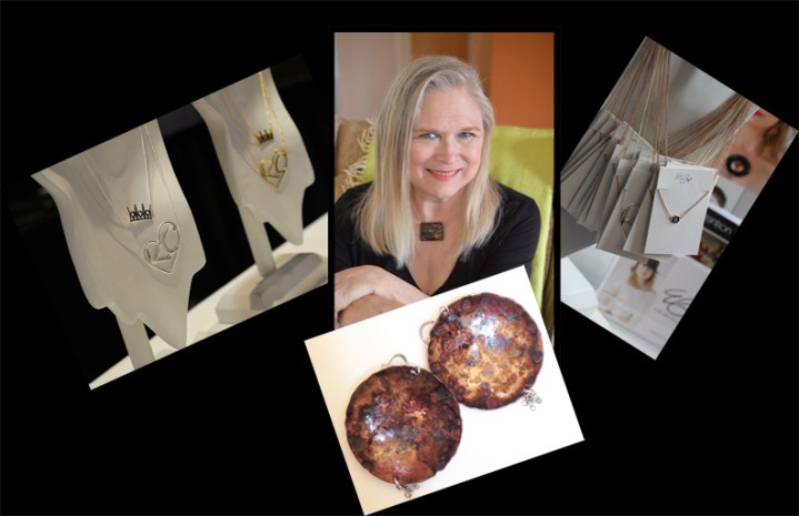 My apologies to Erin because I didn’t get a photo of her and her beautiful jewelry. I shall blame it on the frozen Margaritas. Erin has two lines; an artistic copper patina line and one that features smaller gold and silver pieces. I already have three pieces of Erin Paige Designs jewelry but my eye is on the gold crown pendant. If you know anything about Kansas City, you will know what this means. Here’s a sampling of her jewelry. I am wearing one of my necklaces and snapped a picture of my earrings.