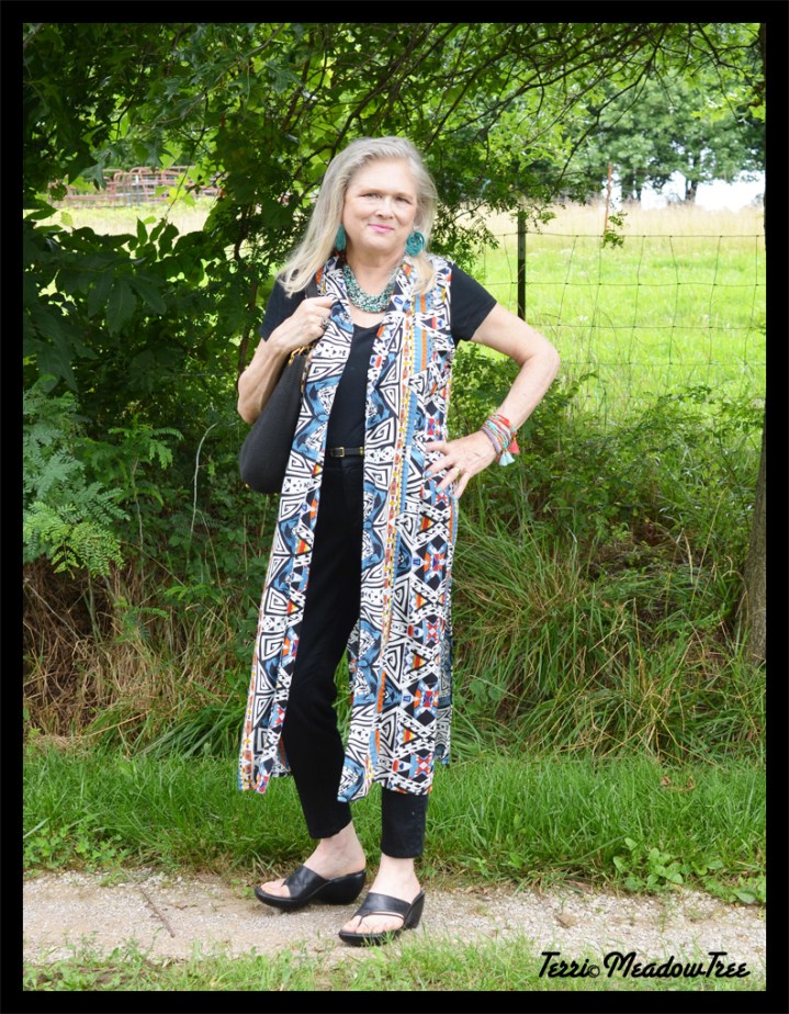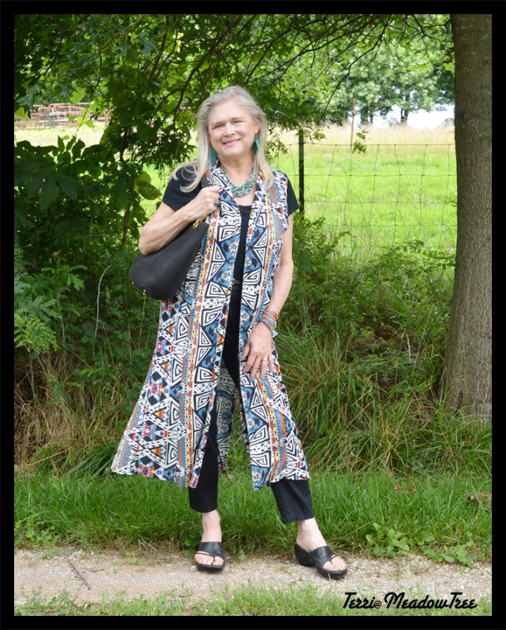 When I’m wearing something this dramatic, I downplay the under layers, so I did a black column with long slim pants by Mango (old but here’s some similar) and a very old but super soft tee shirt that I think I picked up at Walmart during the last decade. I might try something sleeveless later, but I wanted this look for now.