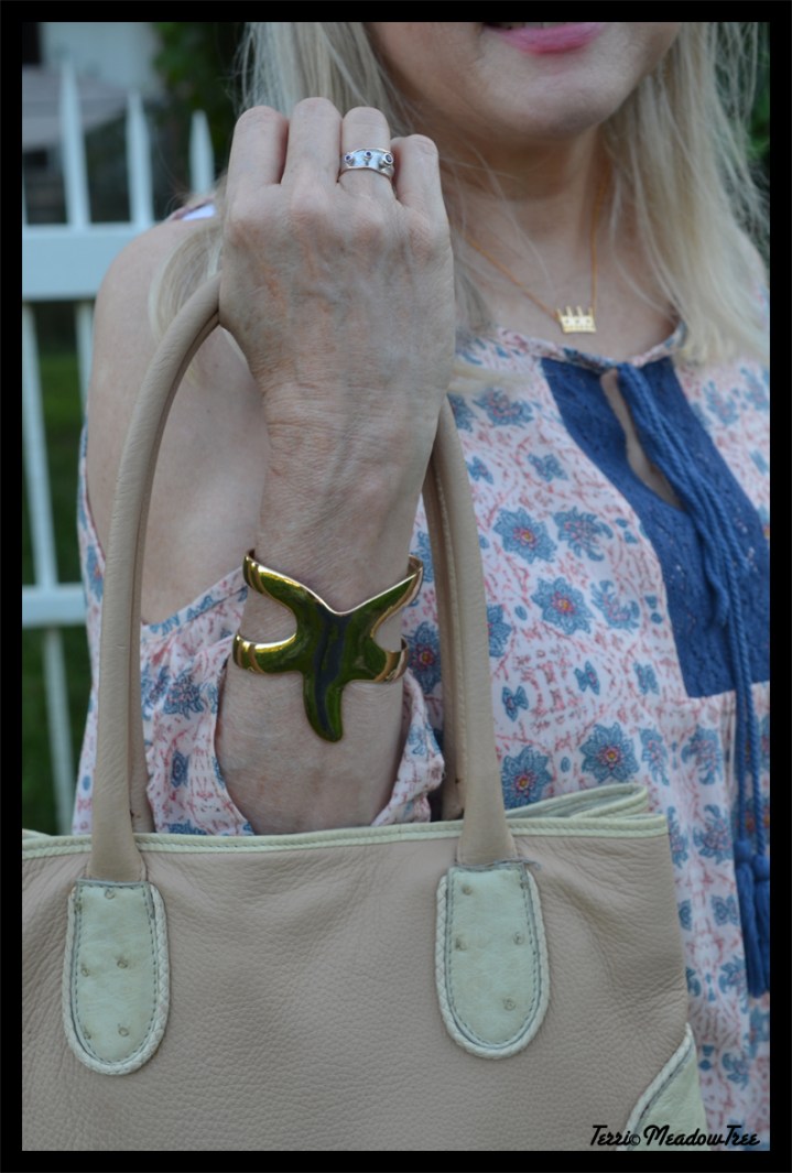 This leather bag is one of my favorites. I found it drastically reduced at a small Kansas City boutique a year ago last spring. There is no tag with a brand name, just “made in Italy” and it is lined with leather. The ostrich embossed leather and the braided corded edging adds those little details that I look for. My Ellen Tracy slings and the neutral pink of the bag match like they were made for each other.