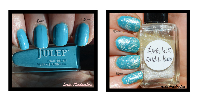 I thought the blue was a tad too strong for this blouse, so I went with one of my favorite glitter toppers; Love, Lace and Lilacs by Lynnderella. It’s one of her classics and I think one of the most beautiful polishes ever made. If you don’t know about Lynnderella, for nail polish, she single handed started the Indie movement. She is the Queen of glitter, as far as I’m concerned. But I only have a few bottles. She’s pretty expensive, so my collection is very limited.