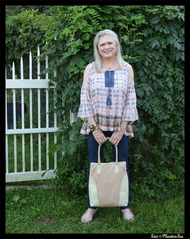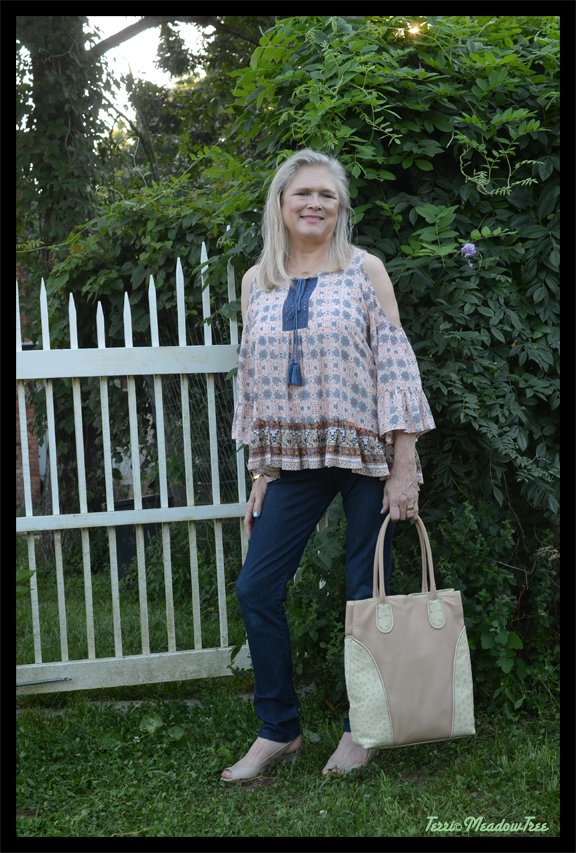 OK, on to style. I finally found a cold-shoulder top that I wanted. Off the shoulders styles are just a no go for me. With all that I have in the “top-shop,” I would have to wear a strapless bra. I tried those back in the day and absolutely hated the strapless. They were so uncomfortable and I felt very insecure in them. So when I saw the cold shoulder design, I knew it was a style I could wear.