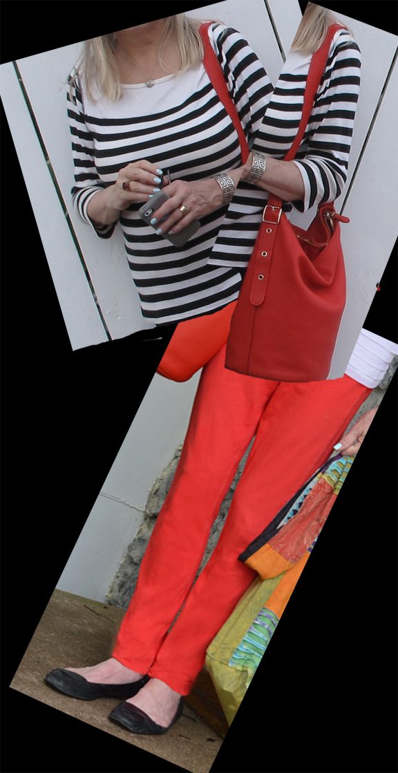 On the trip, I found out that my photographer does not really care for my red jeans. We had one day of just mainly driving and the last combination didn’t get photographed. In lieu, I made a collage. I’ve done a look like this on the blog before with a different black and white stripped top and different shoes.