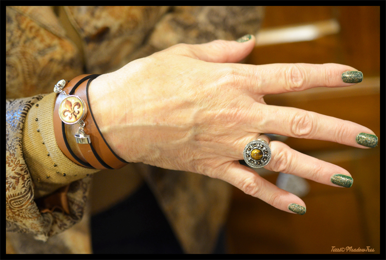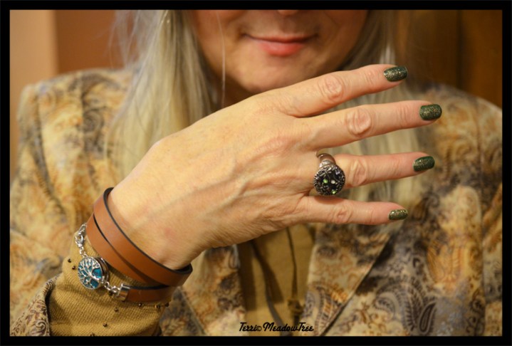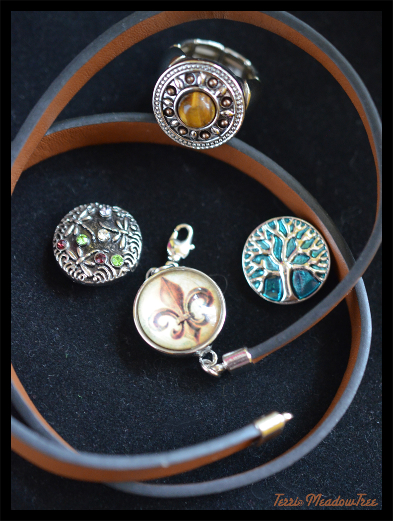 For the most part, this jewelry is the quality you would find at Target and Charming Charlies. However, Bejeweled also offers a finer sterling silver line that is found in the Exclusive Collection. The elements I am wearing were all made in China. Sheree as taken on a personal challenge to have snaps designed and produced in the USA but can only carry those in her shop. If you are interested in what those are, she would welcome email at bejeweledbysheree@yahoo.com. I am also hoping that she puts some of these original designs on her Facebook page.