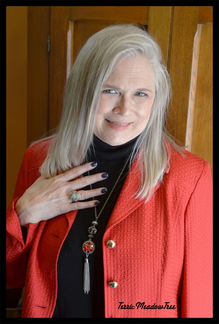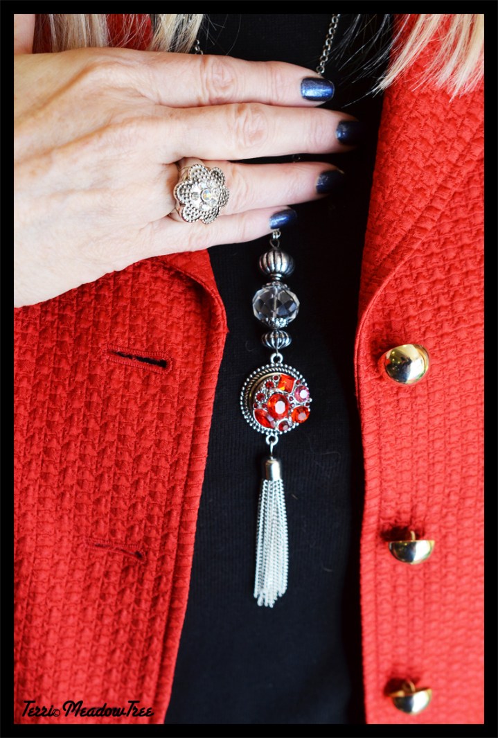 | Red Chunk Metal Snap for the necklace and Dot Flower for the ring. Silk jacket by Juliana Collezione (eBay) |