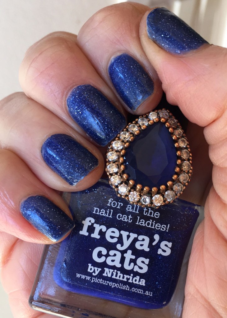 This painting also has a blue tone to it. I consider finger nail polish as an accessory and used one of my favorite blues along with a blue stone ring. Picture Polish is an Indie polish brand from Australia. When I was buying polish, I purchased from Color4Nails (a few years ago). I am happy to see that they still carry Picture Polish. Harlow carries Freya’s Cats but is sold out at the moment. However, their Triton is very close blue. It’s a tad expensive now (it does come from Australia).