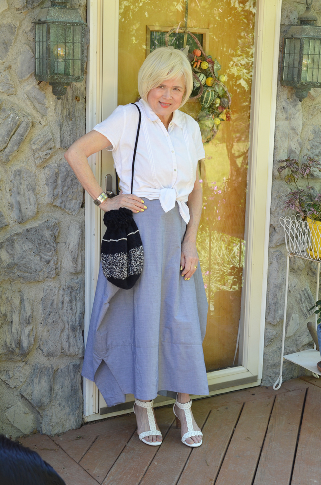 For those warmer summer days, I think this white linen top would be perfect. I also pulled out a bag that I crocheted in the 80’s. I remember not having a pattern, just crocheting until I got what I liked. It’s been stuck away and I forgot how much fun it looks and may have to carry it a bit this summer. I think it fits in nicely with the vibe of this skirt. My white heeled sandals are Adrienne Vittadini, which I’ve had for about a couple of years.