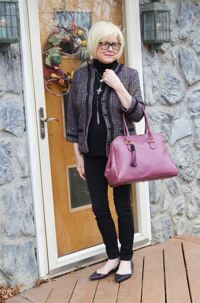 I thought this was a beautiful painting and really didn’t worry if I had anything in my closet that would fit it. These colors are so vibrant and most things in my closet are pretty subdued. But then there is tweed! Some tweeds are woven with a massive amount of colors and textures. The jacket that I chose for this painting has a mixture of mauve, grey, black, white, and tan. Those are some of the colors in “Snow Shadows”.I paired it with black American Eagle jeans and a black short sleeve Pendleton turtleneck,