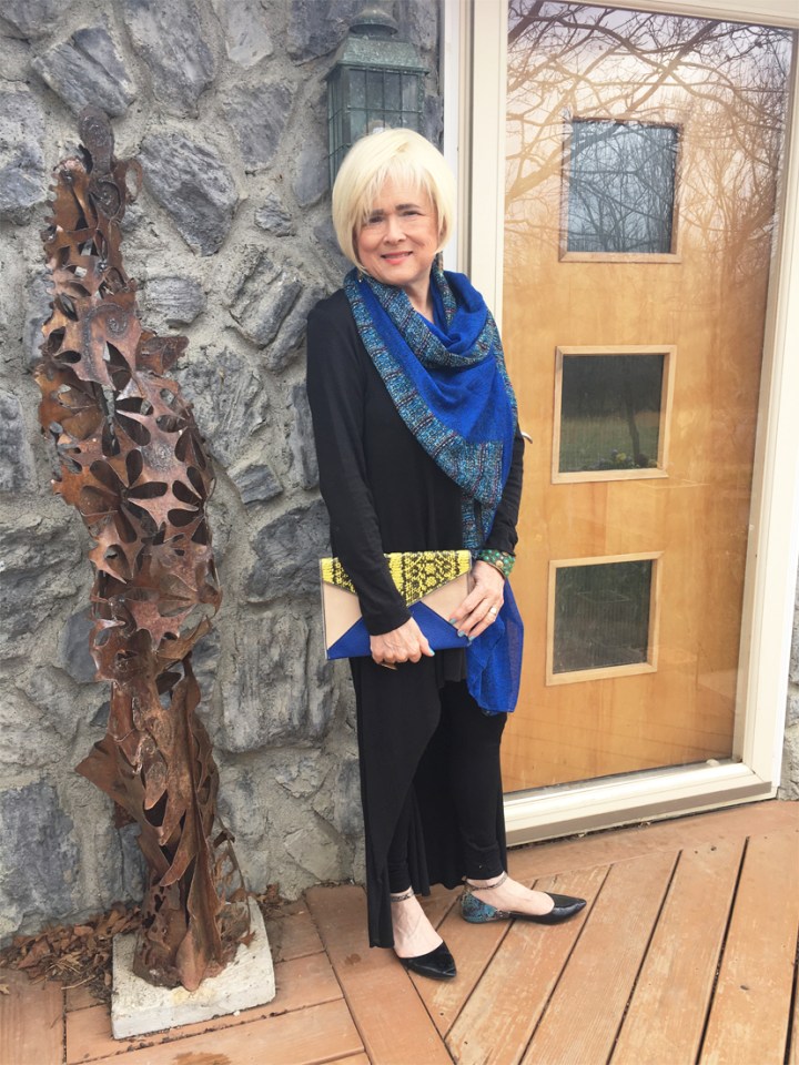Mike has chosen just the right blue shirt for his interpretation. Like me, he also used black in his base outfit (his pants) and included some white. It’s always good to see Mike. He’s our one and only guy who participates.