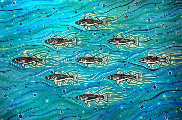For this round, I tried to combine two themes; women in the arts and Earth Month. Being an environmental artist, all of Christi Belcourt’s work would have easily fit into this round. As I mentioned in my two earlier posts, Christi Belcourt is a Métis visual artist. The majority of her work explores and celebrates the beauty of the natural world. Belcourt has created large, mural-sized acrylic paintings that resemble the beadwork of her ancestors and community, She accomplishes this by using her brush (or a needle-like tool) to make tiny dots that resemble traditional beadwork. Her paintings are filled with floral designs that include insects, birds, and other animals, spread out across the canvas. These are not just floral patterns or illustrations but works with meaning.