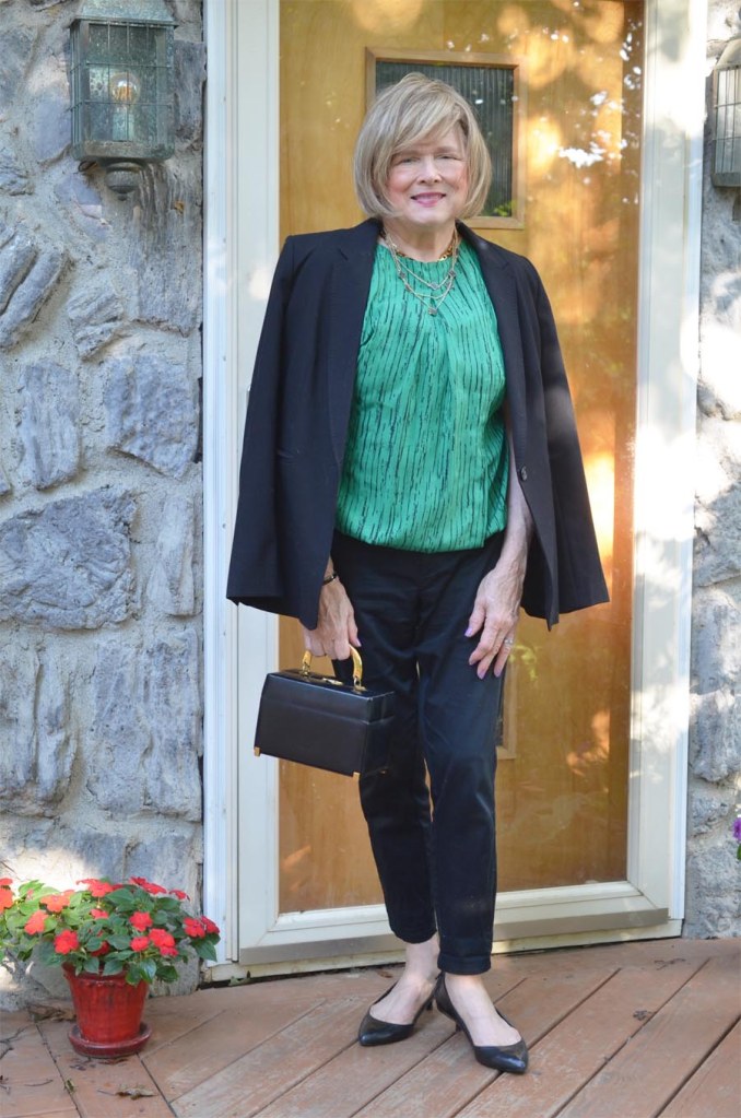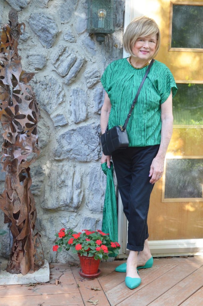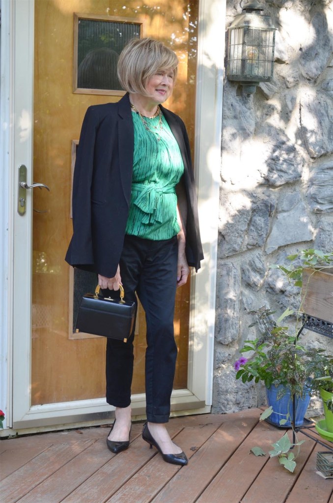 Terri, this top is gorgeous! I love this shade of green. Actually, I love all shades of green so no surprise there. While I do really like your outfit with the black blazer, I am definitely partial to the one with those fabulous green Melissa shoes! I also really love your flashback 2016 outfit with this top. The sash is such a fun addition to play around with!