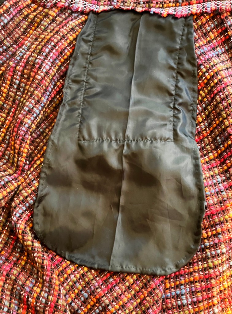 Using black lining created a new problem because with the design of the pocket, the interior of the pocket will be seen. To solve that, I just put a facing piece, using my tweed where eyes could see it.