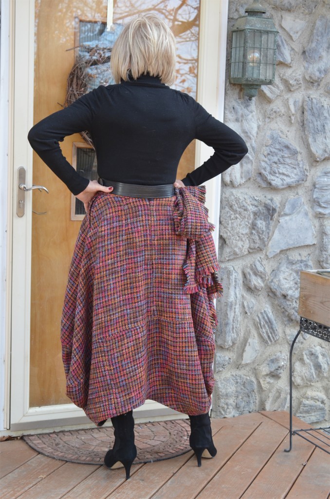 I probably won’t ever wear the shawl with the skirt but for this photo, I threw it on. Given the nature of the fabric, it didn’t take much time or effort to make the fringe edging. I did a machine stitch around the edge to stabilize the piece and to keep it from unraveling more.