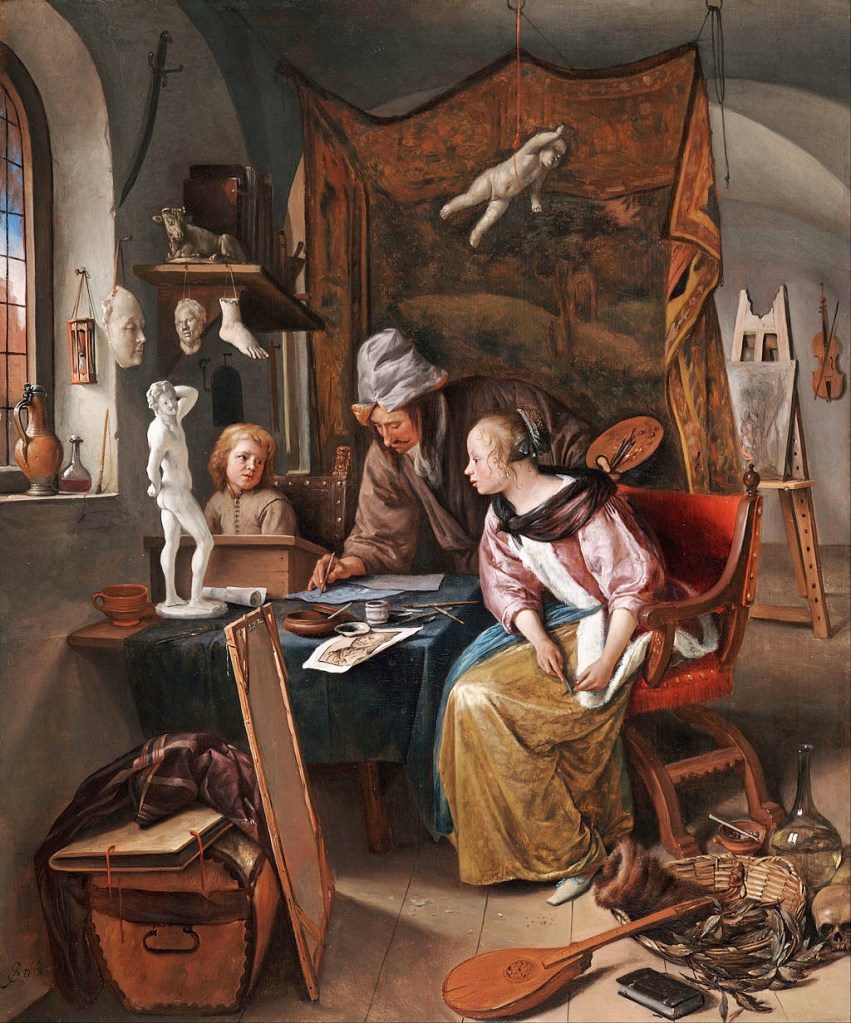 This year, I am starting with Jan Steen. Admittedly, it is not the painting I was looking for. I’ve decided that this year, I am starting research in my personal art library and then seeing where it leads me. This round led me to “The Art Lesson”, by Jan Steen. Being an art teacher for a good part of my life, I thought this was an excellent one to start with.