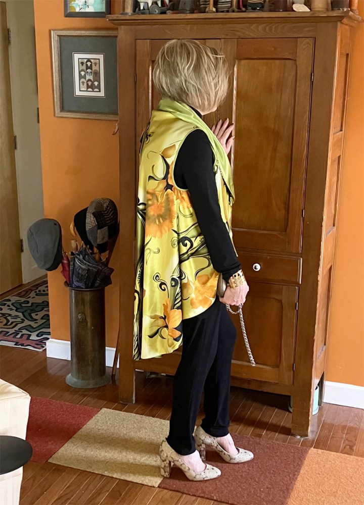 Sally said that she enjoyed putting together this outfit using the rich colors and prints of the artwork and felt quite sumptuous despite the outfit’s simplicity and comfort. Sally’s scarf and addition of gold jewelry is spot on for this work. I think “sumptuous” is the correct work to use when view in this painting.