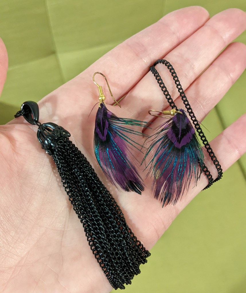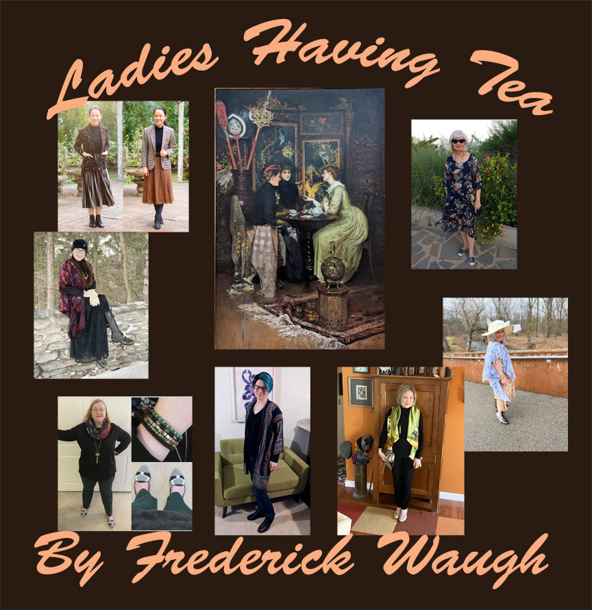 Rachelle says, ” I saw this painting and wanted to step right into it. Despite the ladies being Victorian-dressed, the environment felt a bit bohemian, which is why I chose the patterned wrap (for lack of a better word). I also wanted a casual feel, something I would show up to a tea party wearing. For the accessories, I tried to emulate the giant hatpins, choosing a metal tassel necklace and some peacock feather earrings. “