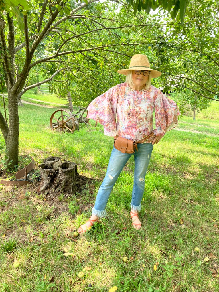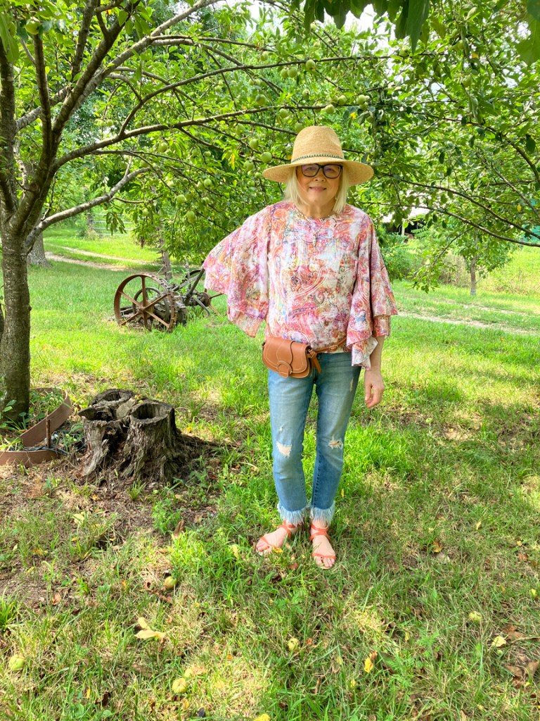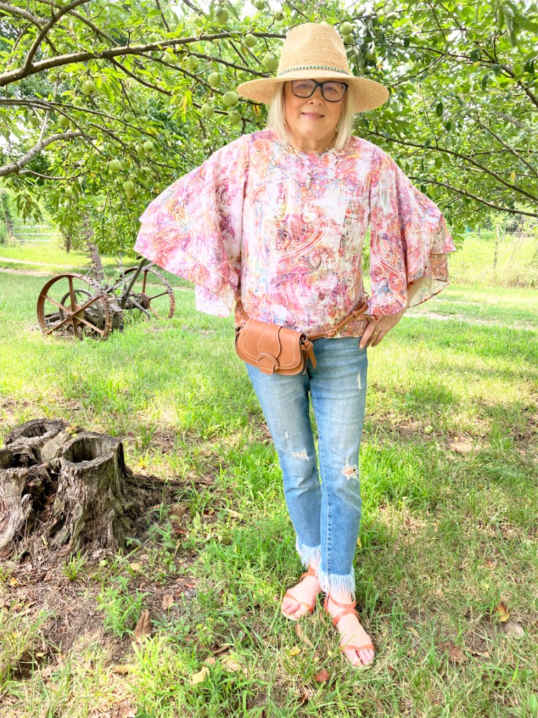 Oh, what a pretty blouse, Terri! I am bummed for you now that your daughter remembered to take it home with her! I love it with those fringed hem jeans and the coral sandals. And of course, your hat is a brilliant finishing touch as always!