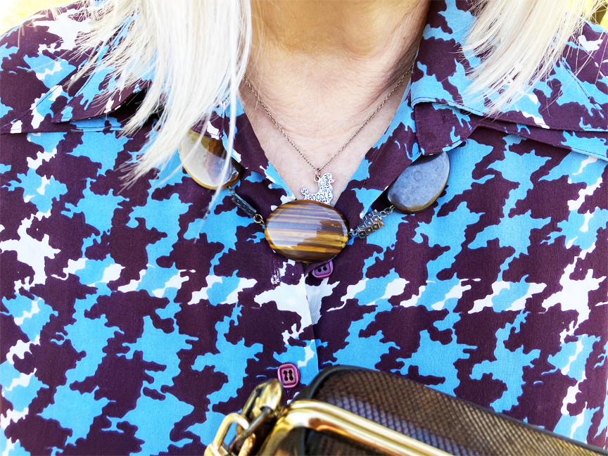 There are many different hues of stones used, however, for me, they give off a brown hue as a group. I had a necklace that I made using some type of semi-precious stones (don’t ask me what they are). Each of the stones is like a little abstract painting. I antiqued some copper findings (I used to shop a lot at Fire Mountain and created a necklace. This is something else that I forget to wear.